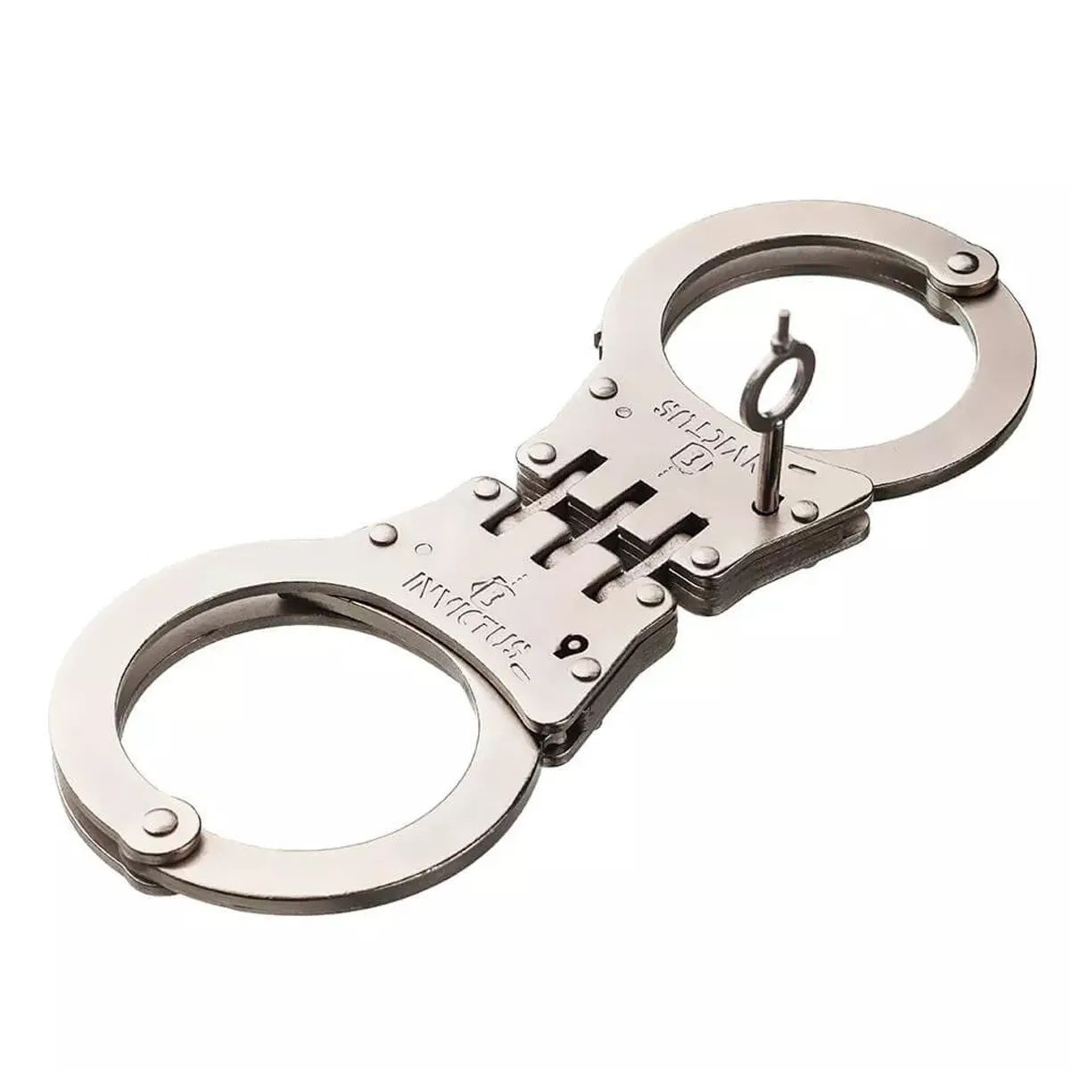 Algema de dobradiça Invictus em aço carbono AISI 1020 com acabamento niquelado prata fosco anti-reflexo. Possui ligação por dobradiça, fechamento por dentes e catraca, e trava de segurança anti-lesão acionada pela chave. Acompanha duas chaves em aço na mesma cor da algema — construída para oferecer resistência e uso seguro em operações profissionais. Disponível na GUNSHOP com envio para todo o Brasil e compra 100% segura.